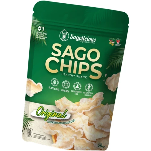 Sagolicious Sago Chip Original adalah camilan sehat berbahan dasar 100% sagu murni, tanpa tambahan MSG, tanpa pengawet, dan tanpa pewarna buatan.