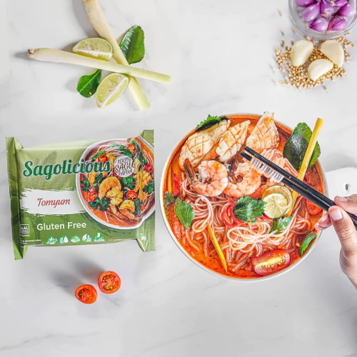 | SAGOLICIOUS KEMASAN ORIGINAL TOMYAM | : | Mie yang dibuat Dari bahan dasar sagu 100% yang di kombinasikan Dengan rasa tomyam yang otentik : GRADE A |